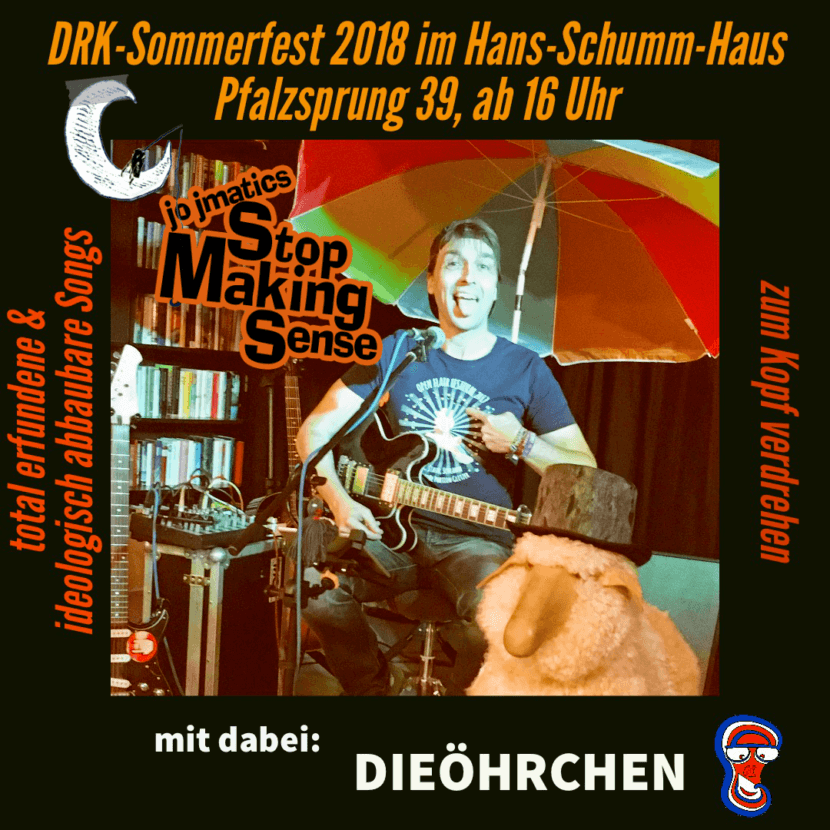 Hallo Therapiegruppe, der Sonnenschirm ist wieder unterwegs. Am Samstag, den 16.06.2018 gibt‘s Freiluftliedermaching mit dem Sohn des Prakti Kant beim DRK-Sommerfest im Hans-Schumm-Haus (Pfalzsprung 39, Bad Kreuznach). Mit dabei auch DIEÖHRCHEN. Ab ca. 17:30 Uhr wird es wohl total erfundene & ideologisch abbaubare Lieder geben. Bis dann jo